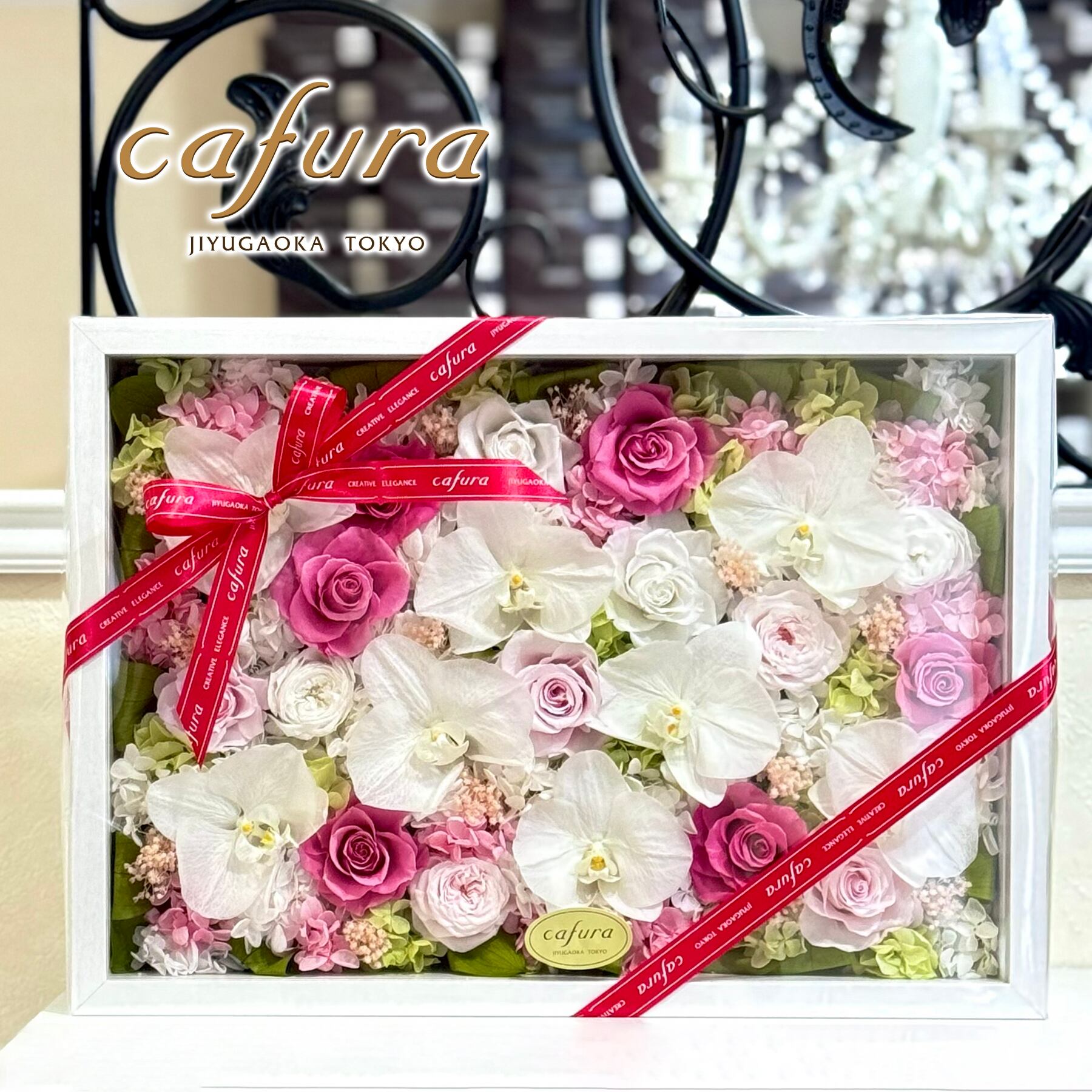 素材:プリザーブドフラワー、木製フレーム、ガラス