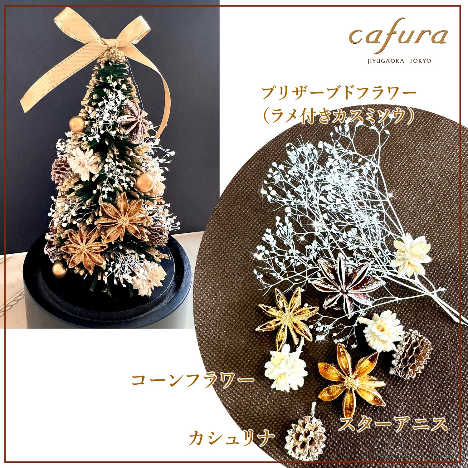 ラメ付きのキラキラと光る繊細な白いプリザーブドのカスミソウが、まるで雪のようにツリーを包み、冬の静けさを表現しています。