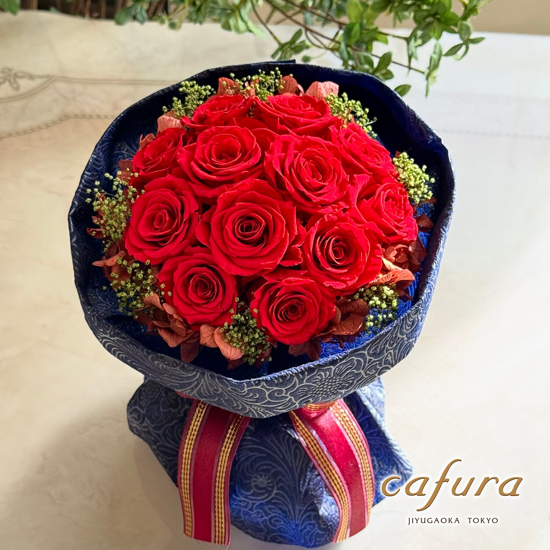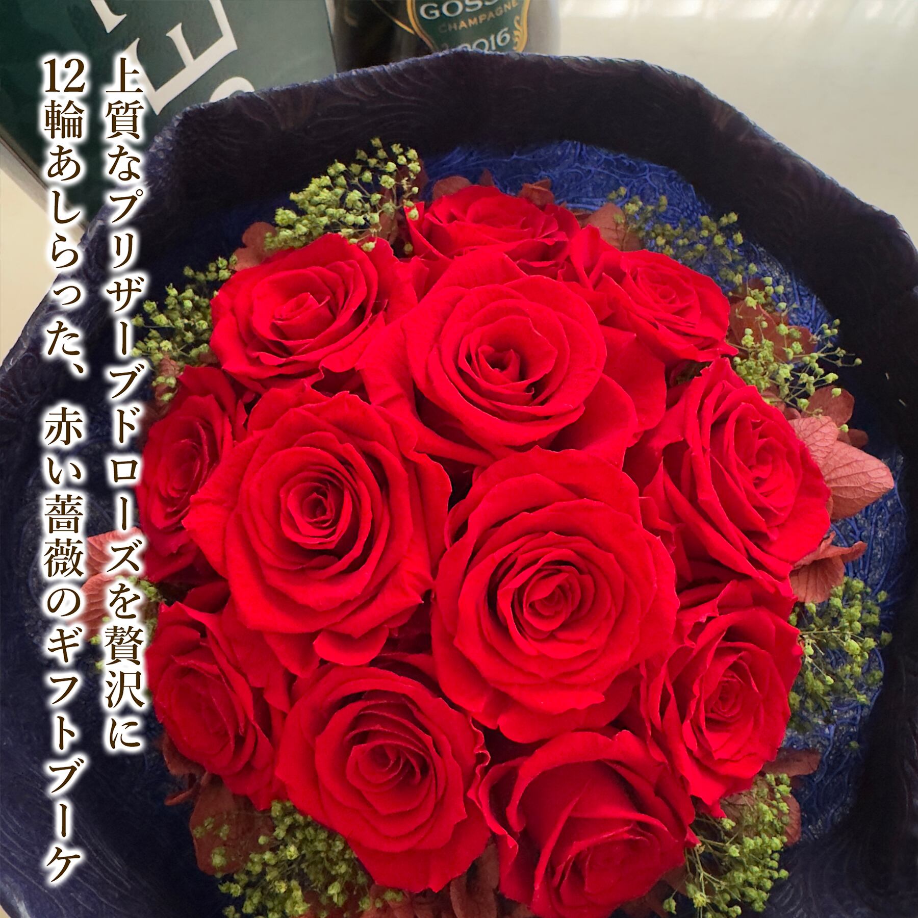 上質なプリザーブドローズを贅沢に12輪あしらった赤い薔薇のギフトブーケです