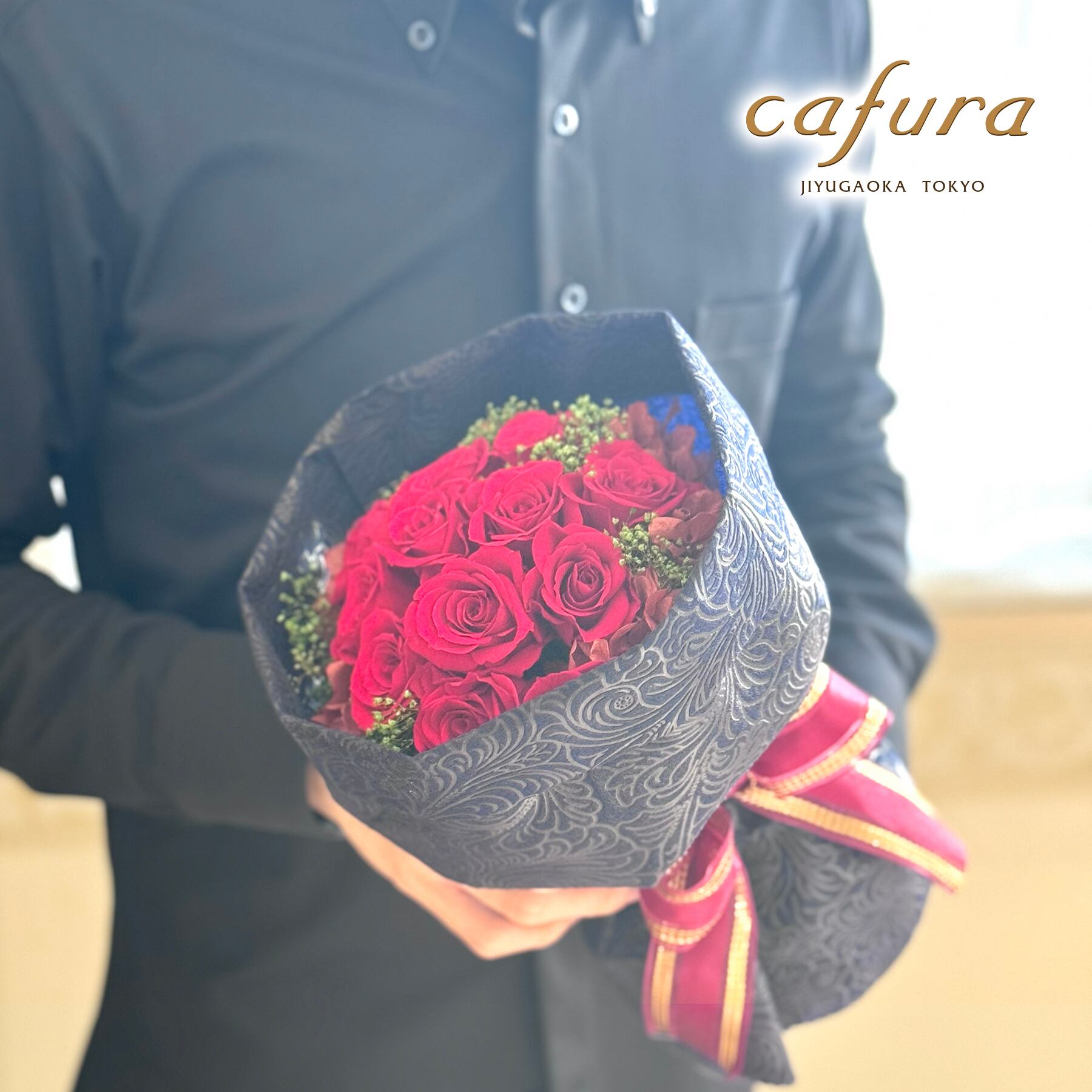 エレガントな濃紺のジャカード柄ラッピングをし、高級感のあるリボン仕上げになっています