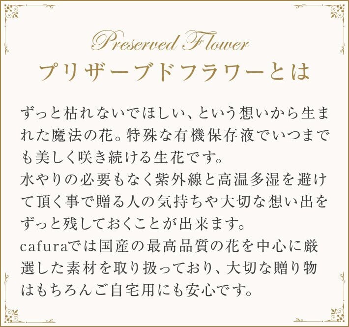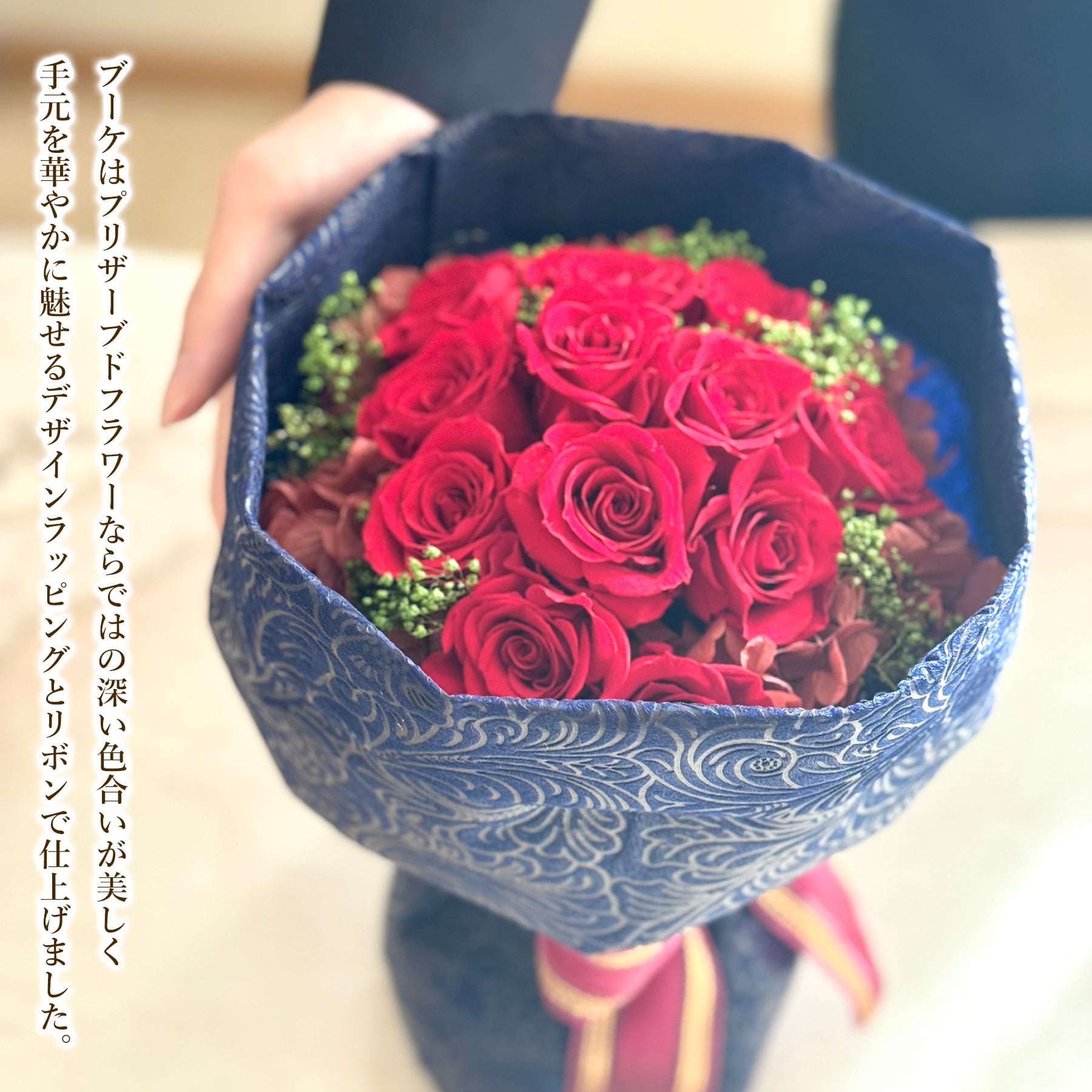 ブーケはプリザーブドフラワーならではの、深い色合いが美しく、