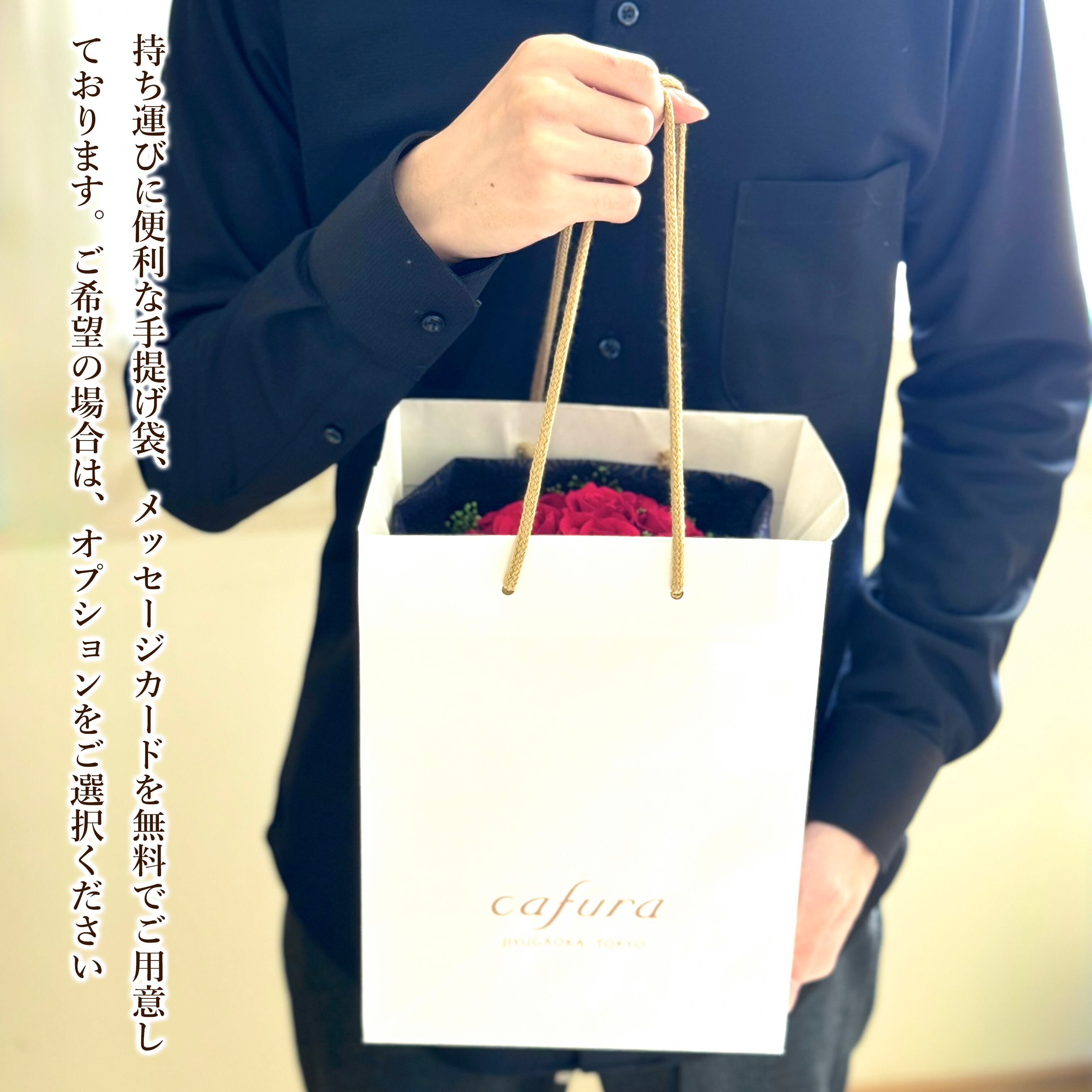 持ち運びに便利な手提げ袋、メッセージカードを無料でご用意しております。