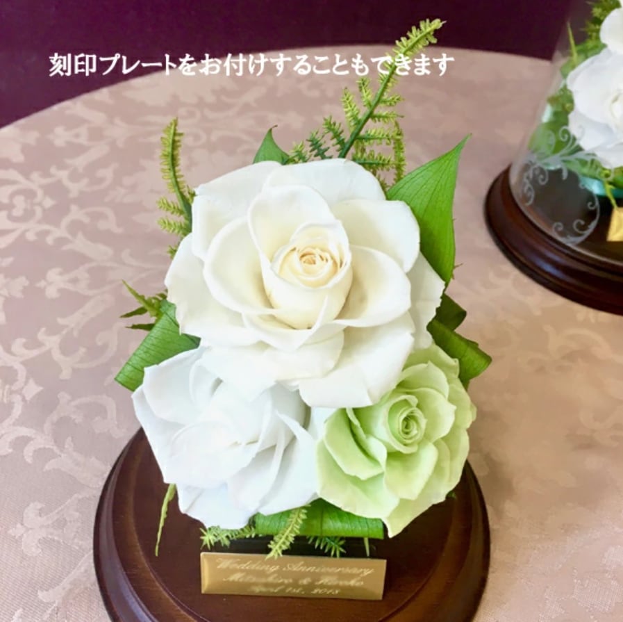 美しい模様の入ったガラスドームのバラがずっと記念に残る贈り物です。