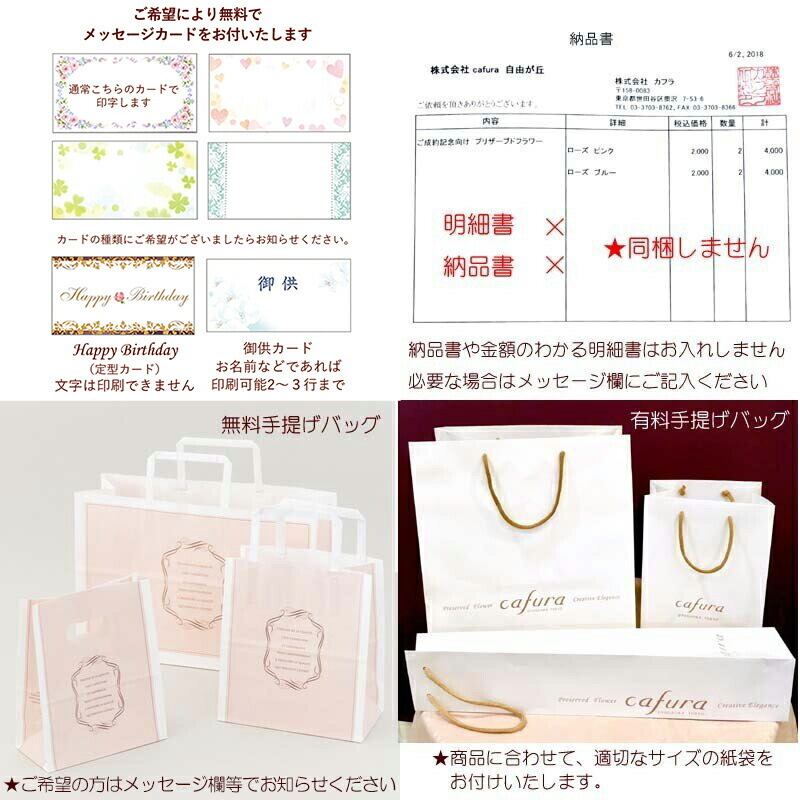 お花を大きく開花させ、美しく豪華にアレンジしています。 また高質プリザを使用しているので、美しさが長持ちします。